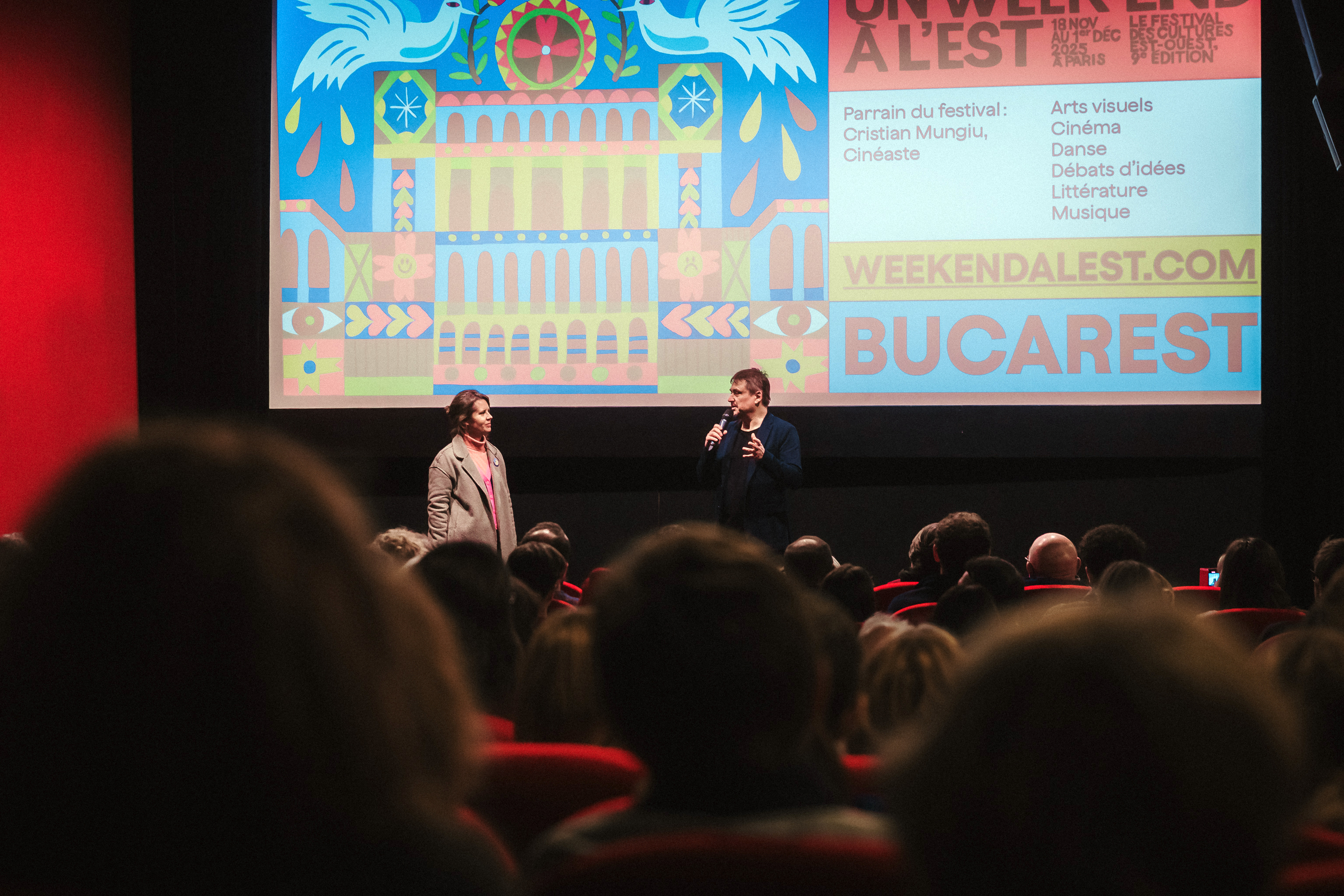 Isabelle Huppert l-a însoțit pe Mungiu și la proiecția filmului 4 luni, 3 săptămâni și 2 zile, de la Cinema Christine. Componenta de cinema a mai cuprins filme de Corneliu Porumboiu, Alexander Nanau, Bogdan Mureșanu și Anca Damian. „Orice alegere de artiști moderni, contemporani, e mai bună decât ideile recurente ale ICR-ului de a face Ziua Poeziei cu lecturi din Eminescu. Cu toată stima pentru cultura română așezată, tradițională, dar găsesc că ea are foarte puțină priză în țările în care încercăm noi să ne promovăm cultura. Cred că ponderea ar trebui să fie un pic mai mult către cultura contemporană, vie, care poate fi însoțită de oameni vii. Marele nostru pariu este să vedem dacă putem să ieșim din provincialismul pe care îl are orice cultură mică. Și cred că uneori reușim. Cred că de asta suntem aici. O parte din artiștii care au fost acum la Paris, în această selecție, reprezintă cumva mici momente de originalitate și de sincronizare cu ceea ce e modern și nu e pășunist.” – Cristian Mungiu.