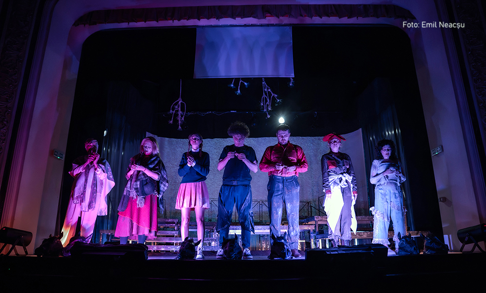 Tânărul regizor Alexandru Weinberger-Bara face însă cu meșteșug altceva în favoarea mesajului umanist. Anume, ia distanță față de povestea concretă a familiei destrămate, dominată de ură, din piesă, printr-o construcție și un decupaj rafinat care introduc o convenție de tipul: priviți și judecați cu mai puțină trăire emoțională. Astfel că organizarea spațiului de o modernitate vădită (scenografia Ionuț Răcoreanu) propune planuri care urmăresc să scoată din realitatea biografică personajele (ele par niște spectre), chiar dacă în acest fel acțiunea și relațiile sunt mai greu de urmărit. Intră și ies ca niște fantoșe ale unui trecut amenințător, iar cineva, o femeie din anturaj, primește sarcina să filmeze ce se vede pentru memoria timpului. (Rolul martorului e jucat cu aplicație și discreție de Natalie Ester.) Imaginea, ca și muzica (Feras Sarmini), joacă, de altfel, un rol important în spectacol, dominând într-un moment esențial scena, când e invadată de măștile animalelor sacrificate în abatoarele morții (un subsidiar al dramei).