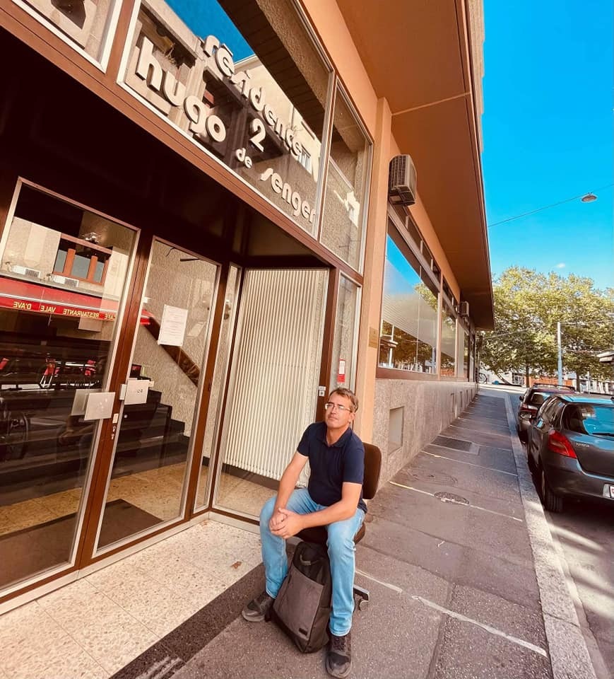 Pe marele platou, în continuare sunt organizate diverse evenimente și, mai ales, de două ori pe săptămână, un celebru târg de vechituri (marché au puce), pe care-l frecventam deseori alături de Mirel Bănică, răscolind prin cutii după chilipiruri, cumpărând cărți la un franc etc. Nu prea am obiceiul să recitesc ceea ce am scris în trecut, dar descoperirea acestor informații despre trecutul platoului meu bien-aimé mi-a stârnit curiozitatea. Îmi aduceam bine aminte, în toamna anului 2001 scrisesem un scurt articol, trimis prin poștă (!) și care exprima destul de bine esența Planpalais-ului, chiar dacă târgul de vechituri, revizitat de mine după două decenii, parcă nu mai avea aceeași intensitate și nici același număr de mușterii (dar poate că explicația rezidă în faptul că era o minunată zi de sâmbătă a lunii august, iar mulți genevezi erau probabil plecați în Cinque Terre sau Cannes). Și acum îmi pare rău că nu am cumpărat nimic de la negustorii care lichidează furniturile armatei elvețiene – ce bricege minunate, ce berete, ce veste călduroase sau bocanci nemuritori! În schimb, am păstrat o fotografie simpatică – autorul acestor rânduri așezat în fața intrării căminului, pe un scaun directorial delabrat, scos în stradă. Tot e ceva.